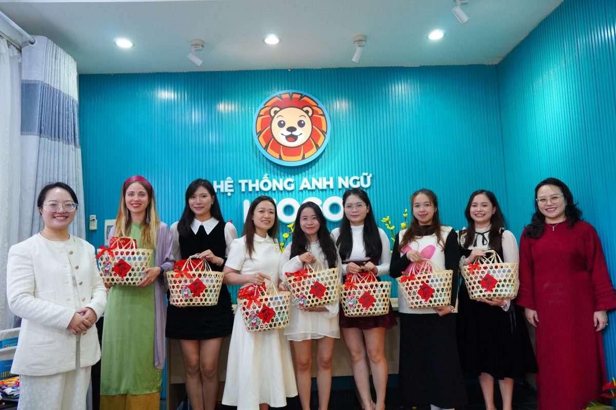 Ngay từ cổng vào, sắc đỏ của câu đối và sắc vàng của hoa mai đã bao trùm không gian. Điều đặc biệt làm nên dấu ấn của môi trường làm việc LEOGO chính là sự chung tay. Thay vì thuê đơn vị trang trí, chính đội ngũ thầy cô giáo đã tự tay cắt tỉa, bài trí từng tiểu cảnh, tạo nên một “Phiên Chợ Quê” vừa mộc mạc vừa gần gũi.