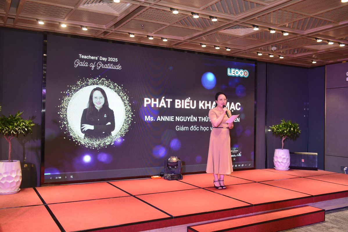 Mở đầu cho chuỗi cảm xúc lắng đọng của đêm tiệc là phần phát biểu của Cô Annie (Diệu Huyền) – Giám đốc Học vụ của hệ thống. Với tư cách là người trực tiếp quản lý, định hướng chuyên môn và sát cánh hàng ngày cùng các thầy cô, cô Annie hiểu rõ hơn ai hết những vất vả và áp lực mà một giáo viên LEOGO phải đối mặt.